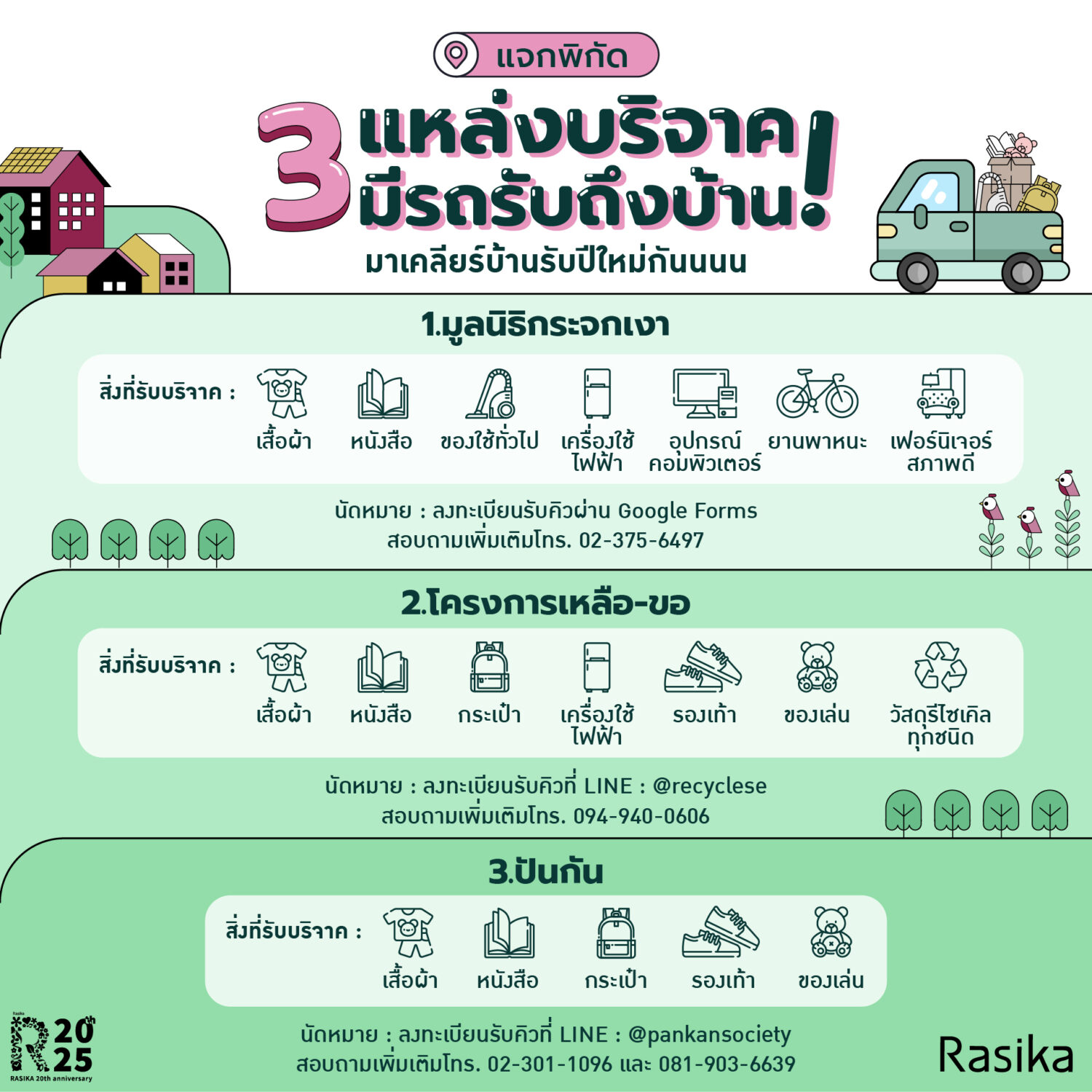 เสื้อผ้า,กระเป๋า,รองเท้า,หนังสือ,ของเล่น,เครื่องใช้ไฟฟ้า,วัสดุรีไซเคิลทุกชนิด